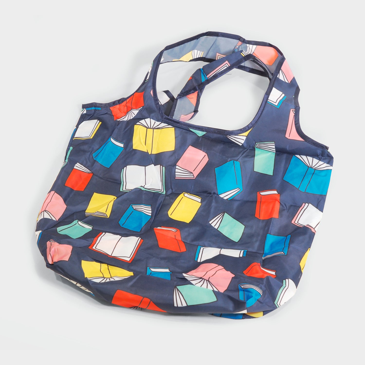 Carry your next great read (and everything else) in style with this foldable tote bag covered in a playful books pattern. Lightweight yet sturdy, it folds up easily into the attached pouch to tuck into your purse, backpack, or glove compartment.