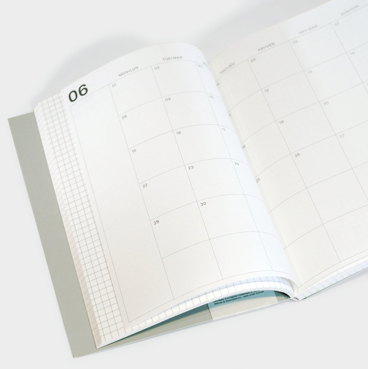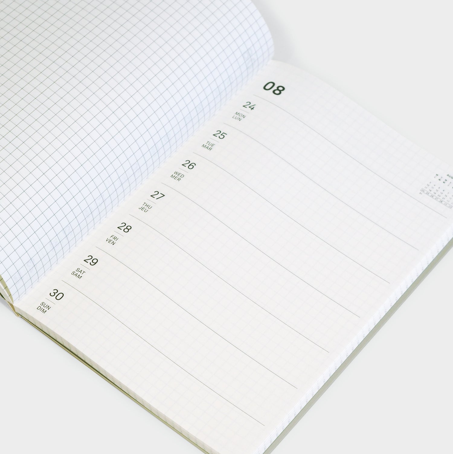 Additional DetailsHalf grid paper / half weekly layout on every spread, Grid pages for notes, sketches, lists, and ideas, Weekly pages to plan tasks and track priorities