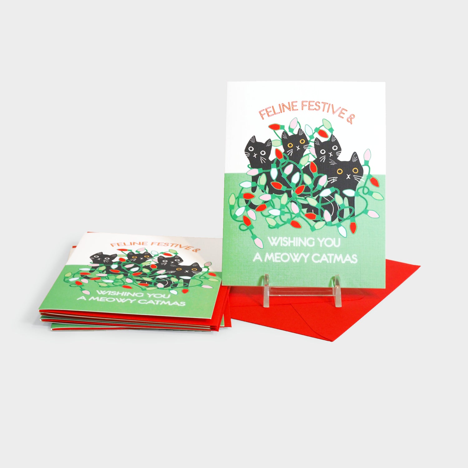 Image reads, "Feline Festive & Wishing You a Meowy Catmas."