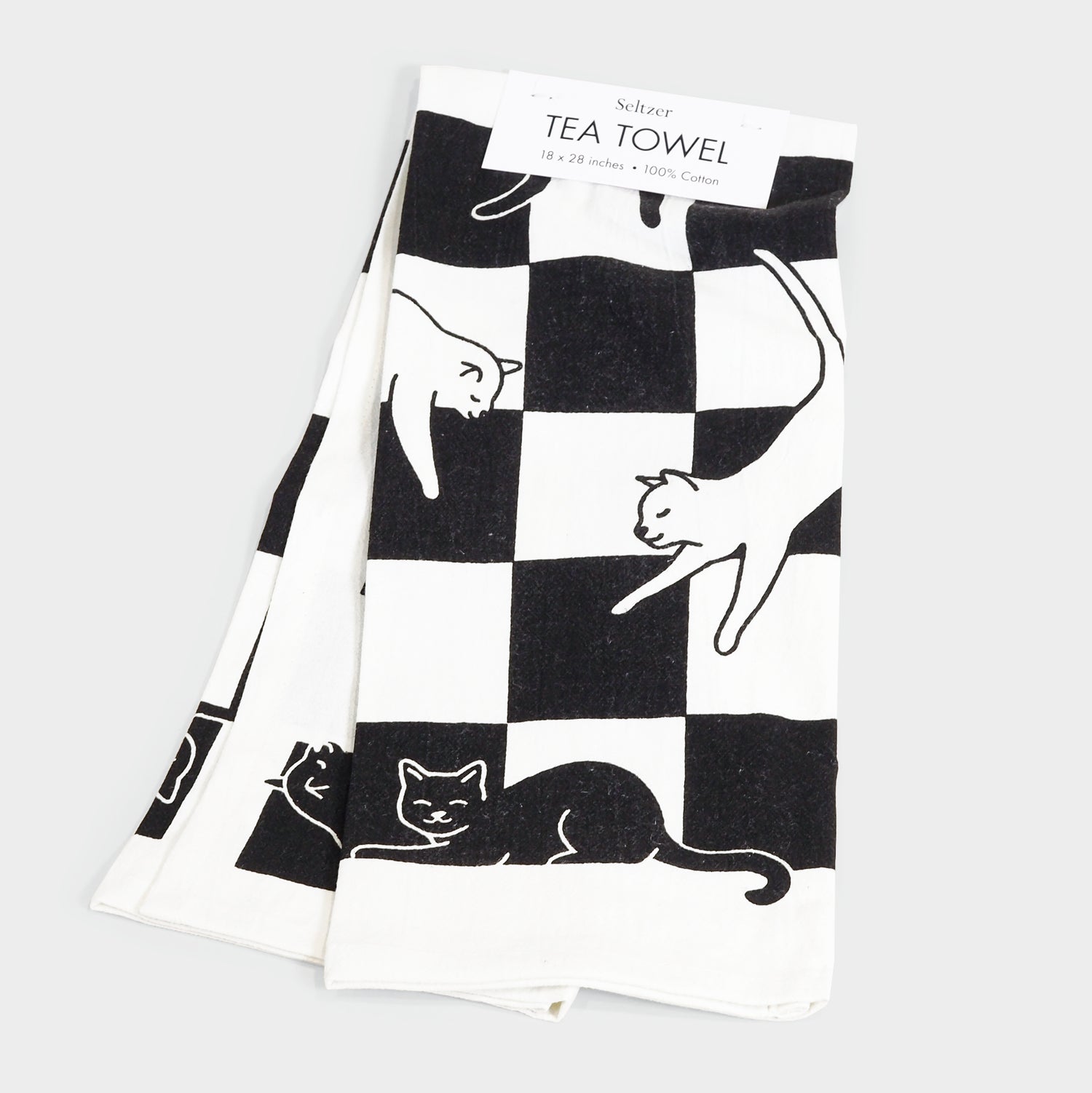 This cotton flour sack towel will keep your kitchen cozy, stylish, and clean. Features a checkered, black-and-white cat design.