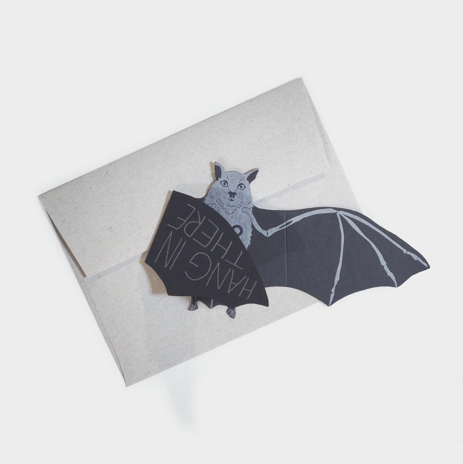 Flat, die-cut card with envelope. Reads, "Hang in there."